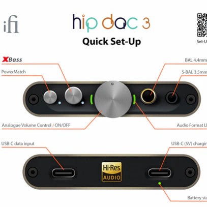 hip-dac 3 understøtter op til 32-bit/384kHz lyd via sin USB-C indgang, med et asynkront design for jitterfri datatransmission. Den tilbyder en 3,5 mm single-ended udgang med S-Balanced kredsløb og en 4,4 mm balanceret udgang, samt et 2.200 mAh batteri, der giver op til 12 timers afspilningstid.